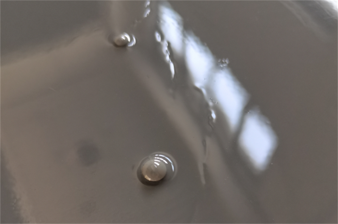 表現(xiàn)為漆膜中存在著類似于針刺成的細孔。主要因為地坪漆涂料中的氣體能透過涂膜釋放到涂層外,但溶劑已基本揮發(fā),涂料黏度過高,氣泡造成的小孔已無法自動消除。